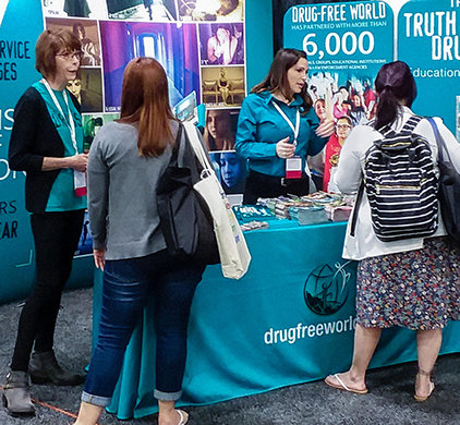 對一位來自喬治亞州,亞特蘭大家長教師聯誼會的代表來說,這件事十分真實,而她同時也是一位指導年輕海軍陸戰隊的老師。她來到攤位,說她已經開始使用無毒世界的線上資源,並分享這對她的學生帶來何種影響。她同時也為學生提供無毒世界基金會的小冊子,好讓他們帶回家,並提醒自己在學校所學到的內容。她很喜歡這些小冊子,因為「內容完全依照事實,而且能讓人輕易加以應用。」